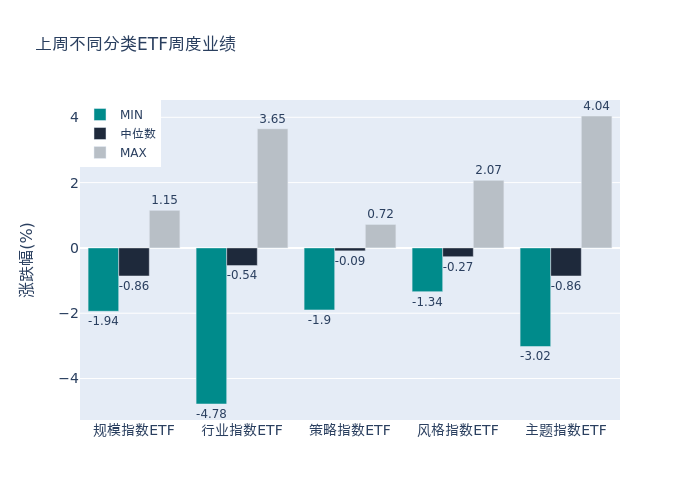 上周股票型ETF周度收益率中位数为-0.78%。其中按照不同分类,规模指数中万家国证2000ETF周度收益率最高,为1.15%;行业指数中国泰中证全指通信设备ETF周度收益率最高,为3.65%;策略指数中红利LV周度收益率最高,为0.72%;风格指数中国寿安保创精选88ETF周度收益率最高,为2.07%;主题指数中华夏中证动漫游戏ETF周度收益率最高,为4.04%。