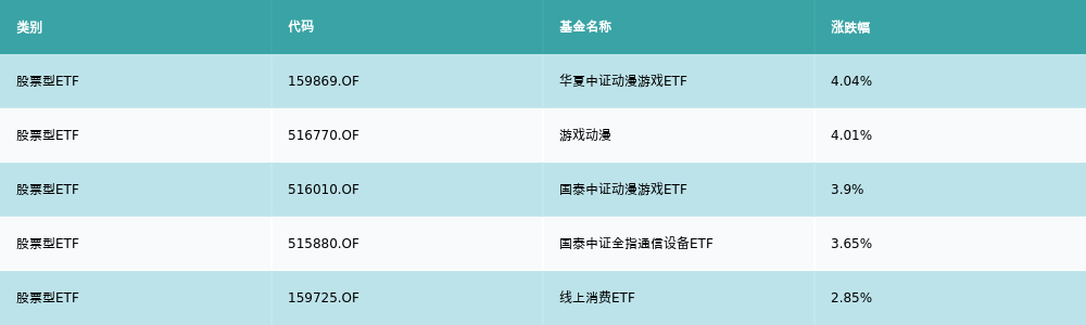 上周股票型ETF涨幅最高的5支ETF及其收益率分别为:华夏中证动漫游戏ETF(4.04%)、游戏动漫(4.01%)、国泰中证动漫游戏ETF(3.9%)、国泰中证全指通信设备ETF(3.65%)、线上消费ETF(2.85%)。详情见下表: