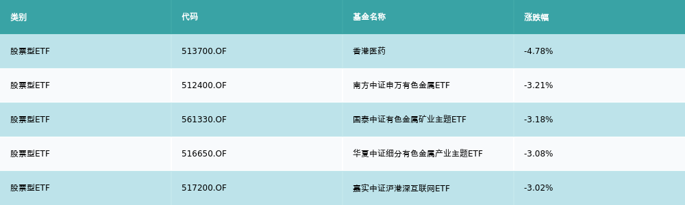 上周股票型ETF跌幅最大的5支ETF及其收益率分别为:香港医药(-4.78%)、南方中证申万有色金属ETF(-3.21%)、国泰中证有色金属矿业主题ETF(-3.18%)、华夏中证细分有色金属产业主题ETF(-3.08%)、嘉实中证沪港深互联网ETF(-3.02%)。详情见下表: