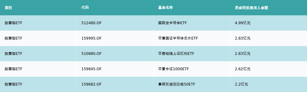 上周股票型ETF资金流入最多的5支ETF及其流入金额分别为:国联安半导体ETF(流入4.99亿元)、华夏国证半导体芯片ETF(流入2.83亿元)、华泰柏瑞上证红利ETF(流入2.83亿元)、华夏中证1000ETF(流入2.62亿元)、景顺长城创业板50ETF(流入2.2亿元)。详情见下表: