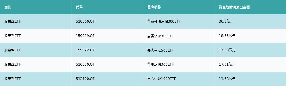 上周股票型ETF资金流出最多的5支ETF及其流入金额分别为:华泰柏瑞沪深300ETF(流出36.8亿元)、嘉实沪深300ETF(流出18.63亿元)、嘉实中证500ETF(流出17.68亿元)、华夏沪深300ETF(流出17.31亿元)、南方中证1000ETF(流出11.68亿元)。详情见下表: