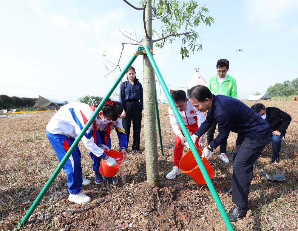 活动现场,团省委副书记梁均达作动员讲话,他表示此次活动的开展是省市区三级共青团向广大青年发出春天之约,参与到绿美广东生态建设当中,号召广大青年厚植理念,当好绿美广东的宣传员,手植绿树,勇当绿美广东的排头兵,绿色生活,争做绿美广东的守护者,共同在生态建设中绽放绚丽的青春之花。当天,省青联委员、跳水奥运冠军大满贯谢思埸,省学联执行主席、在粤港生陈童,南航基层乘务部副经理、团委书记张苧予等6位青年代表共同为“青年林”揭牌,在南沙栽下一片绿色希望。