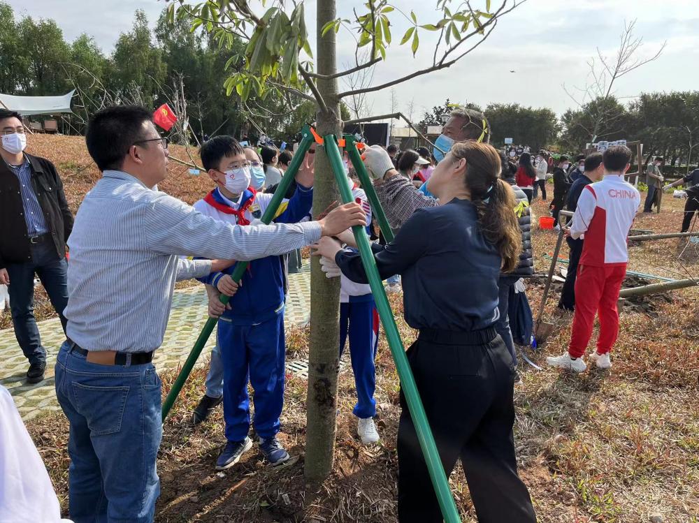 随后,在南沙湿地公园相关工作人员讲解演示下,活动参与者多人搭档、分工明确、相互配合,搬苗、扶苗、培土、修坑、浇水,每道工序有条不紊、配合默契,科学栽下每棵异木棉。在春光明媚的南沙,新栽的树木迎风挺立,展现出勃勃生机,也充分彰显了粤港澳大湾区团结、协作的精神。