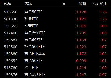 截至发稿,有色50ETF(516650)、矿业ETF(561330)、有色金属ETF(512400)、有色60ETF(159881)、有色ETF基金(159880)、有色50ETF(159652)等纷纷涨超1%。