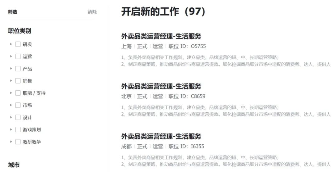 通过字节跳动官网搜索可见,与“外卖”相关的岗位共有97个,其中有如外卖行业产品经理(商家方向),工作内容包括负责抖音生活服务外卖业务B端产品体系的搭建,不断探索商家增长模式,对行业收入结果负责等。