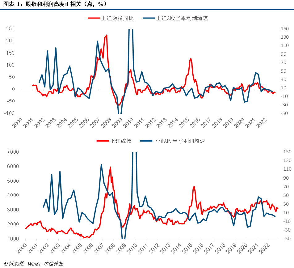 利润趋势决定股指走势。影响股市走向和波动的因素繁多,既有宏观经济层面的,诸如经济增长速度、价格走势、库存形势、宏观和产业政策等,也有金融层面的,如利率、货币供应量、社会融资规模、信贷规模等,还有市场风险偏好层面的,国际国内金融市场波动、国际局势变化、中美关系等等。但归根结底,金融资产定价的本质仍是未来现金流折现,因此实际上前述种种因素最终影响的落脚点还是企业当前及未来利润、折现率。从我国历史数据来看,利润趋势大体决定了股指走势。