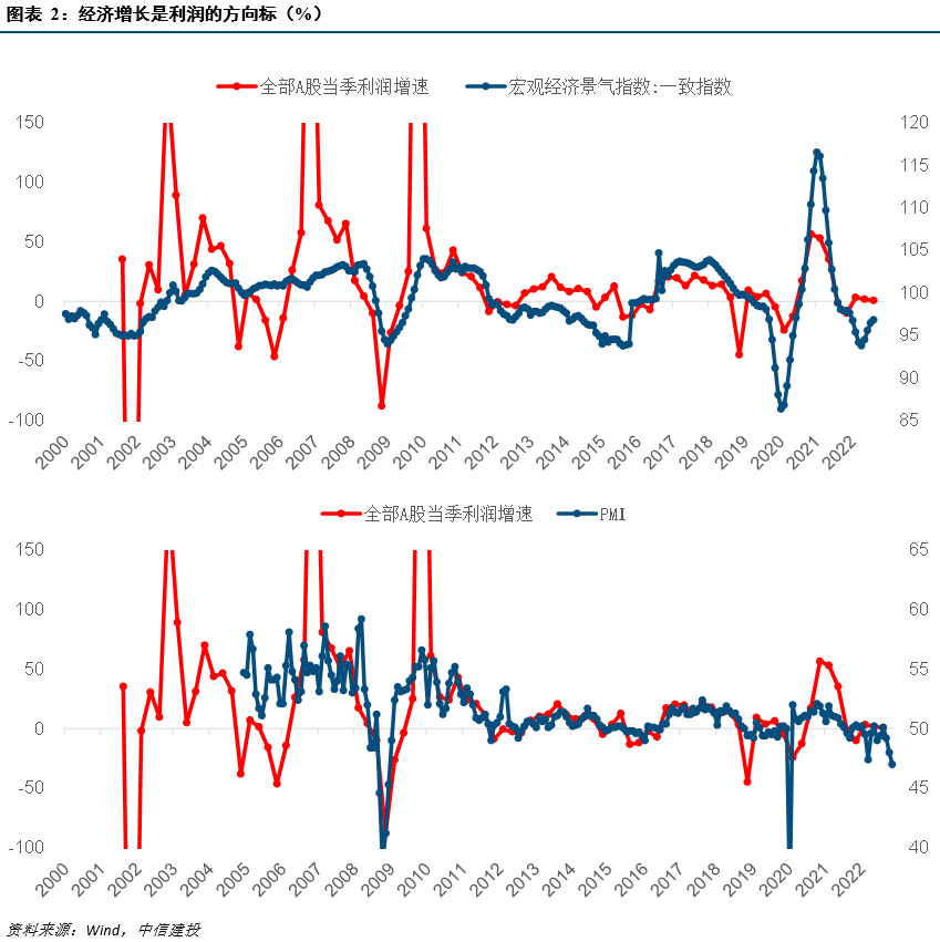 利润趋势决定股指走势,而决定利润方向的是经济增长形势。经济增长是以不变价核算的,因此实际上是“量”的含义。在价格不过大幅度波动下,经济周期向上,则意味着产出的量增加,企业的利润改善,经济周期向下,则意味着产出的量减少,企业的利润走弱。回溯我国历史数据,宏观经济景气指数、PMI等经济增长指标与企业利润增速的走势一致性较高,经济的拐点基本上也是利润的拐点。
