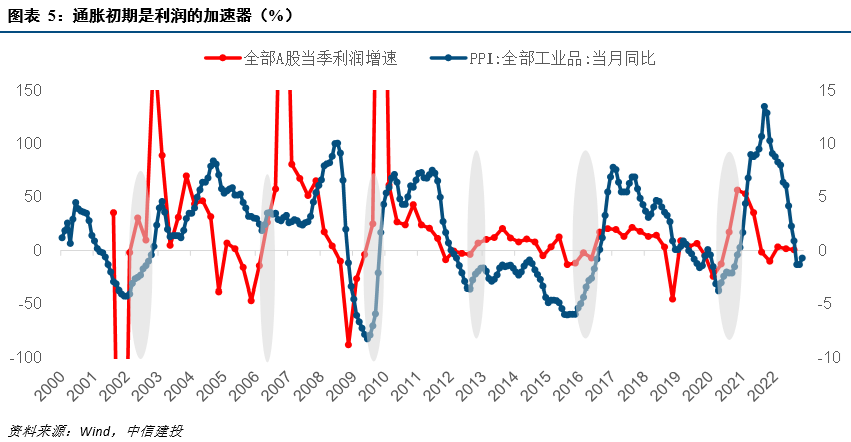 通胀初期是利润的加速器。企业的利润不仅由“量”决定,还受“价”影响。由于企业利润是名义变量,从逻辑上说,会受到“量”、“价”两方面影响。但回溯我国相关历史数据来看,现实情况中“价”和利润的走势有一定相关性,但相关性总体上弱于“量”,一是利润的拐点常常领先于“价”,二是,“价”进入高增长阶段后,A股整体利润往往受到压制走弱。实际上,利润拐点虽然由经济增长的拐点决定,但利润的弹性来自通胀,通胀初期是利润的加速器,这一阶段是有积极意义的。