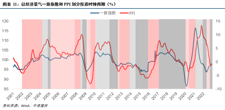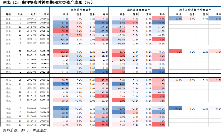 从美林投资时钟出发,也可以得到相似结论。美林时钟按美国GDP增速和通胀趋势将经济状态划分为衰退(经济下行、通胀下行)、复苏(经济上行、通胀下行)、过热(经济上行、通胀上行)、滞胀(经济下行、通胀上行)四个周期,对应最好的资产类别选择分别为债券、股票、商品、现金。将美林时钟应用到我国来看,由于我国2012年后GDP波动较小,因此经济增长方面我们选用宏观经济景气一致指数和中国综合PMI指标替代,其波动范围相对更大一些;通胀方面由于我国CPI更多受猪周期扰动,CPI周期并不完全反应需求端冷热,且我国是工业大国,因此用PPI指标替代。将我国2002年以来的处于同一周期的所有月份数据汇总,计算各类资产月收益的算数平均值,结果是符合美林时钟的,复苏期股票月均收益4.0%(四类资产中收益排第一),过热期商品月均收益1.5%(排第一),滞胀期现金月均收益0.2%(与债券并列第一),衰退期债券月均收益0.7%(排第一);从期间累计收益看,虽并非每个阶段都完全符合,但胜率表现仍是符合美林时钟的。2023年上半年,经济向上,通胀筑底,属于复苏时钟期,因此股票资产表现将占优。下半年,剔除基数影响后的经济预期延续改善,通胀处于回升初期,属于过热时钟期,理论上权益资产不占优,但实际上这是从整个周期来看的,如果仅看过热期的早期,权益资产仍有较好表现,这与我们关注增长拐点和通胀初期的意义是一致的。