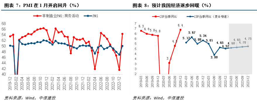 当前是新一轮经济复苏的起点。2023年1月以来,随着阳性病例达峰回落,疫情对我国经济的制约逐步趋弱,制造业PMI从12月底部的47反弹至50.1,非制造业PMI从12月底部的41.6反弹至54.4,经济已触底回升。我们预计疫后就业、收入、消费之间将形成正反馈,相互促进,经济复苏是渐进的,并非一次性释放。此外,随着地产政策的加速调整,房地产对经济的拖累效应也将逐步减低。整体上经济将逐步改善,当前是新一轮复苏的起点。