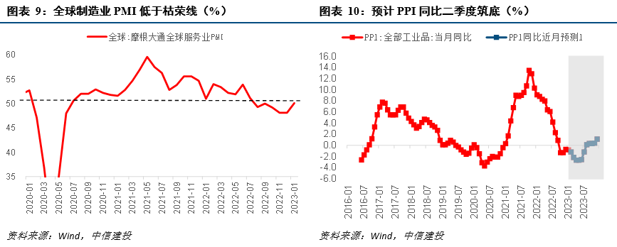 通胀正处于下行尾声。当前全球制造业表现延续走弱,PMI连续6个月在枯荣线之下运行,基本面对大宗商品价格支撑不强,预计短期大宗商品价格仍偏弱震荡运行,上半年PPI同比在高基数的效应下继续回落。下半年,随着中国经济继续回暖,海外经济筑底,美联储结束加息,基本面和估值面对大宗商品的压力有望改善,叠加PPI基数走低,预计PPI同比将触底回升,助力企业利润加速改善。