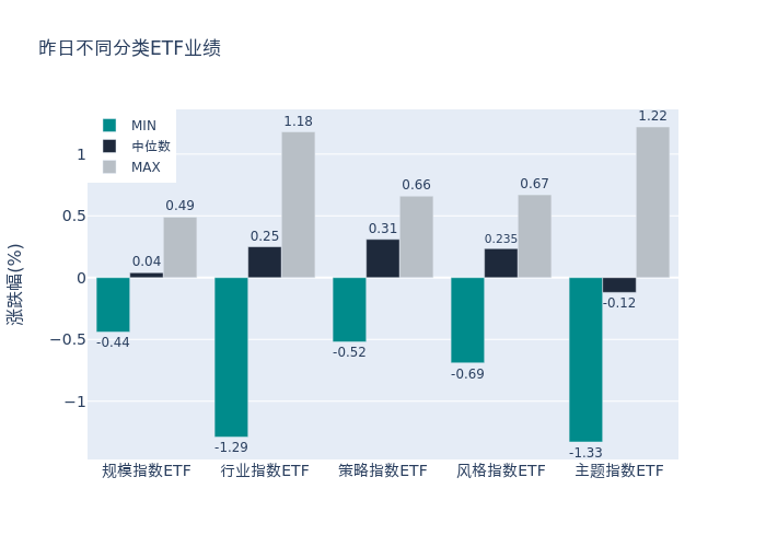 昨日股票型ETF收益率中位数为-0.01%。其中按照不同分类,规模指数中500指增收益率最高,为0.49%;行业指数中国泰中证钢铁ETF收益率最高,为1.18%;策略指数中景顺长城中证红利低波动100ETF收益率最高,为0.66%;风格指数中华夏中证智选500价值稳健策略ETF收益率最高,为0.67%;主题指数中华夏中证石化产业ETF收益率最高,为1.22%。