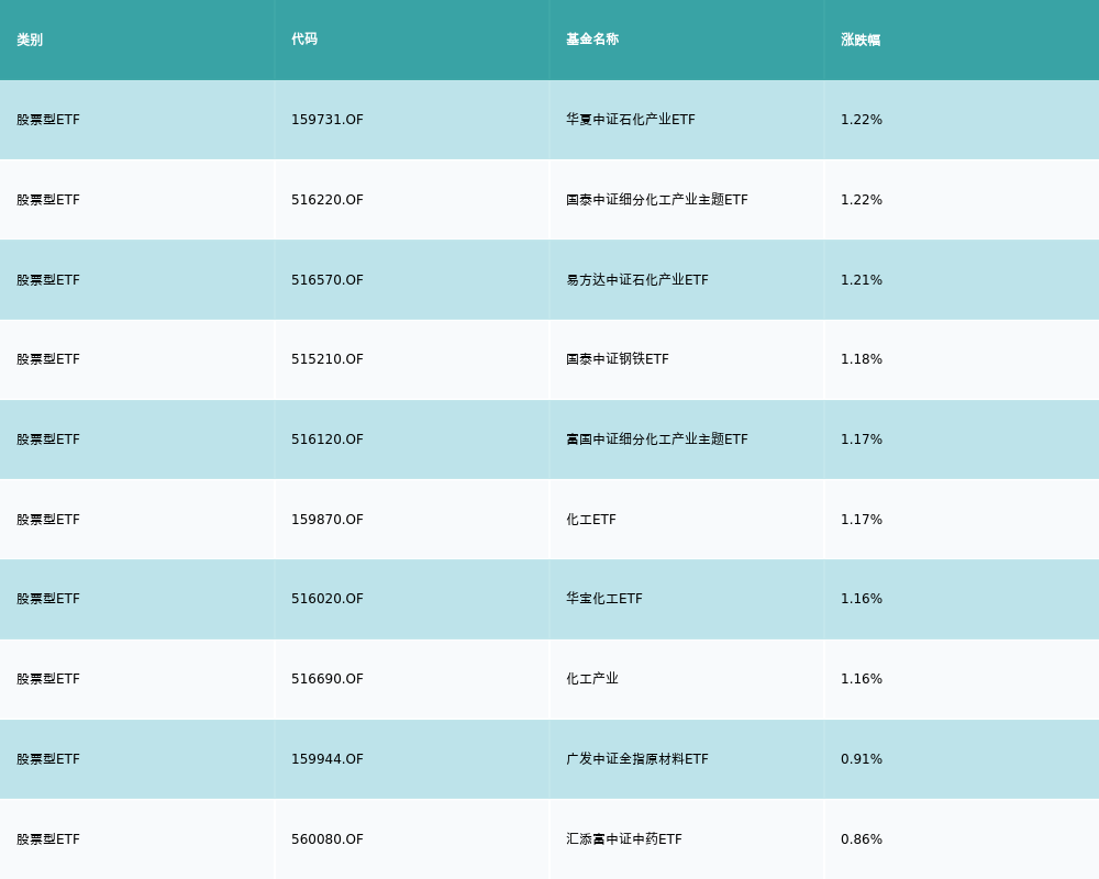 昨日股票型ETF涨幅最高的3支ETF及其收益率分别为:华夏中证石化产业ETF(1.22%)、国泰中证细分化工产业主题ETF(1.22%)、易方达中证石化产业ETF(1.21%)。涨幅前10详情见下表:
