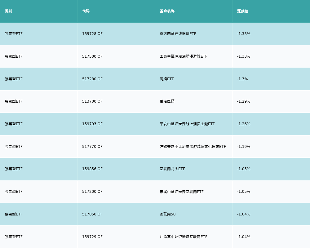 昨日股票型ETF跌幅最大的3支ETF及其收益率分别为:南方国证在线消费ETF(-1.33%)、国泰中证沪港深动漫游戏ETF(-1.33%)、网购ETF(-1.3%)。跌幅前10详情见下表:
