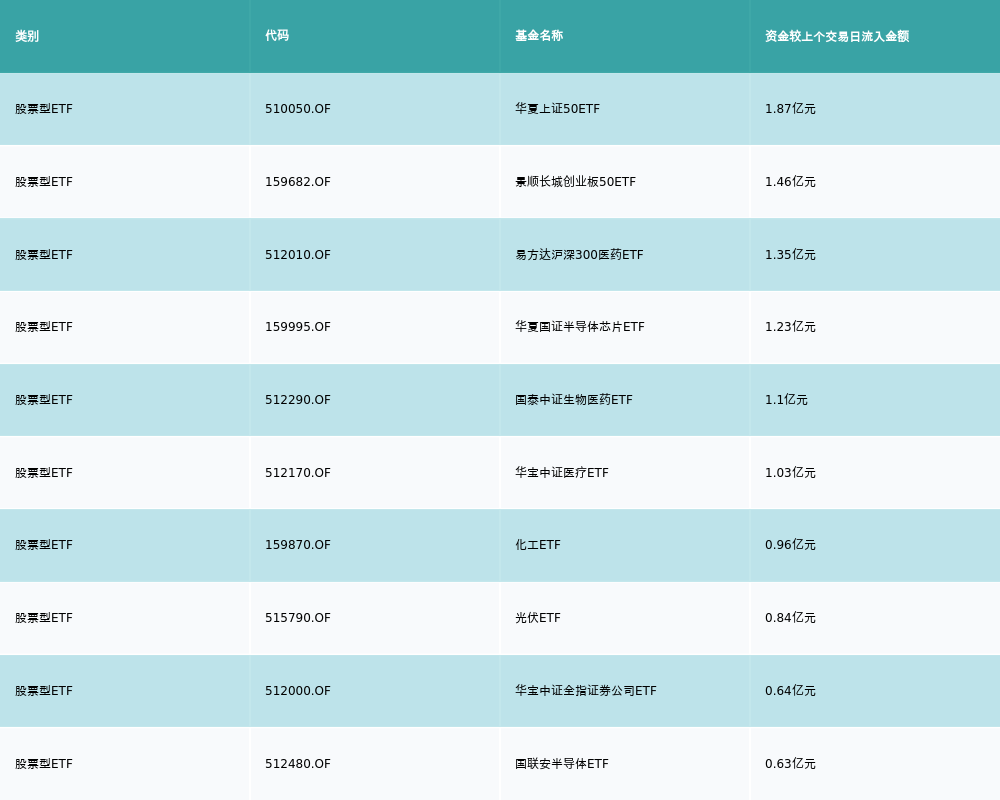 昨日股票型ETF资金流入最多的3支ETF及其流入金额分别为:华夏上证50ETF(流入1.87亿元)、景顺长城创业板50ETF(流入1.46亿元)、易方达沪深300医药ETF(流入1.35亿元)。资金流入前10详情见下表: