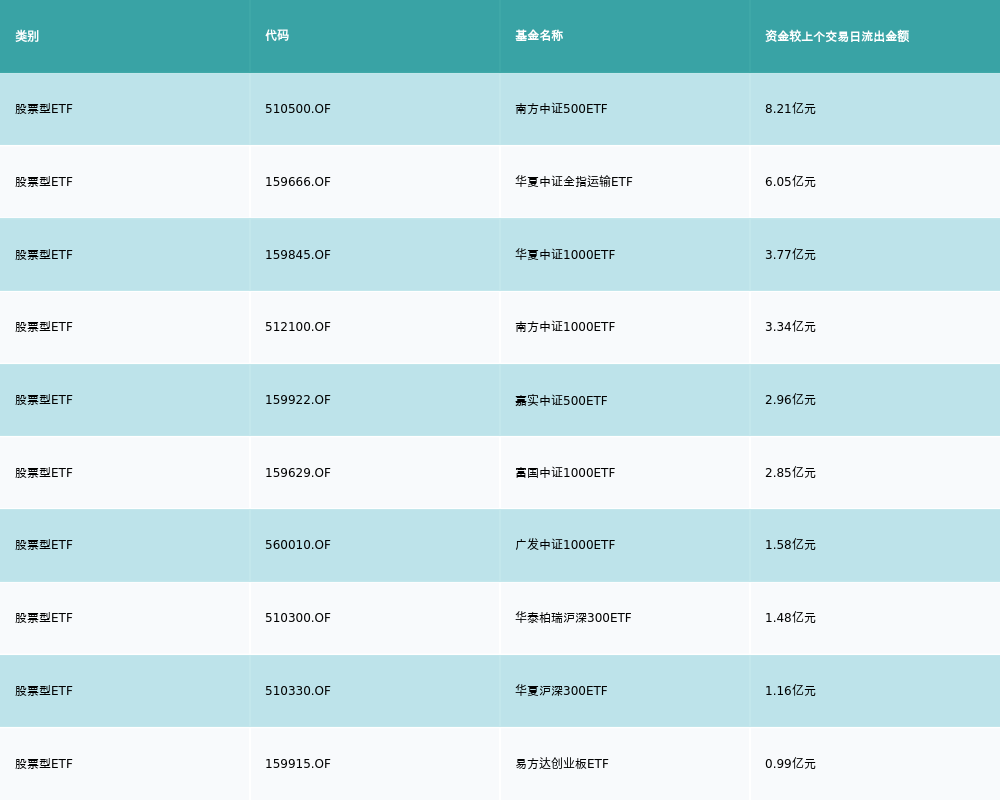 昨日股票型ETF资金流出最多的3支ETF及其流入金额分别为:南方中证500ETF(流出8.21亿元)、华夏中证全指运输ETF(流出6.05亿元)、华夏中证1000ETF(流出3.77亿元)。资金流出前10详情见下表: