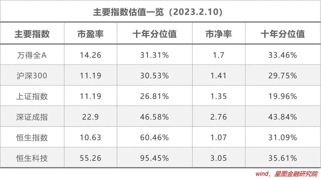 从主要指数的估值来看,现阶段市场已经走出绝对低估领域。以万得全A为例,截至2023年2月10日市盈率十年分位值为31.31%,市净率分位值为33.46%,虽然低于估值中枢,但已算不得绝对低估。