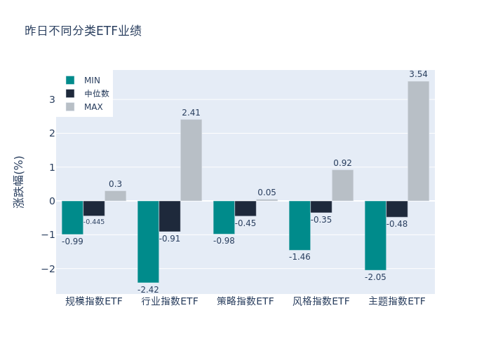 昨日股票型ETF收益率中位数为-0.52%。其中按照不同分类,规模指数中万家国证2000ETF收益率最高,为0.3%;行业指数中国泰中证全指通信设备ETF收益率最高,为2.41%;策略指数中华安中证500低波ETF收益率最高,为0.05%;风格指数中国寿安保创精选88ETF收益率最高,为0.92%;主题指数中华夏中证大数据产业ETF收益率最高,为3.54%。