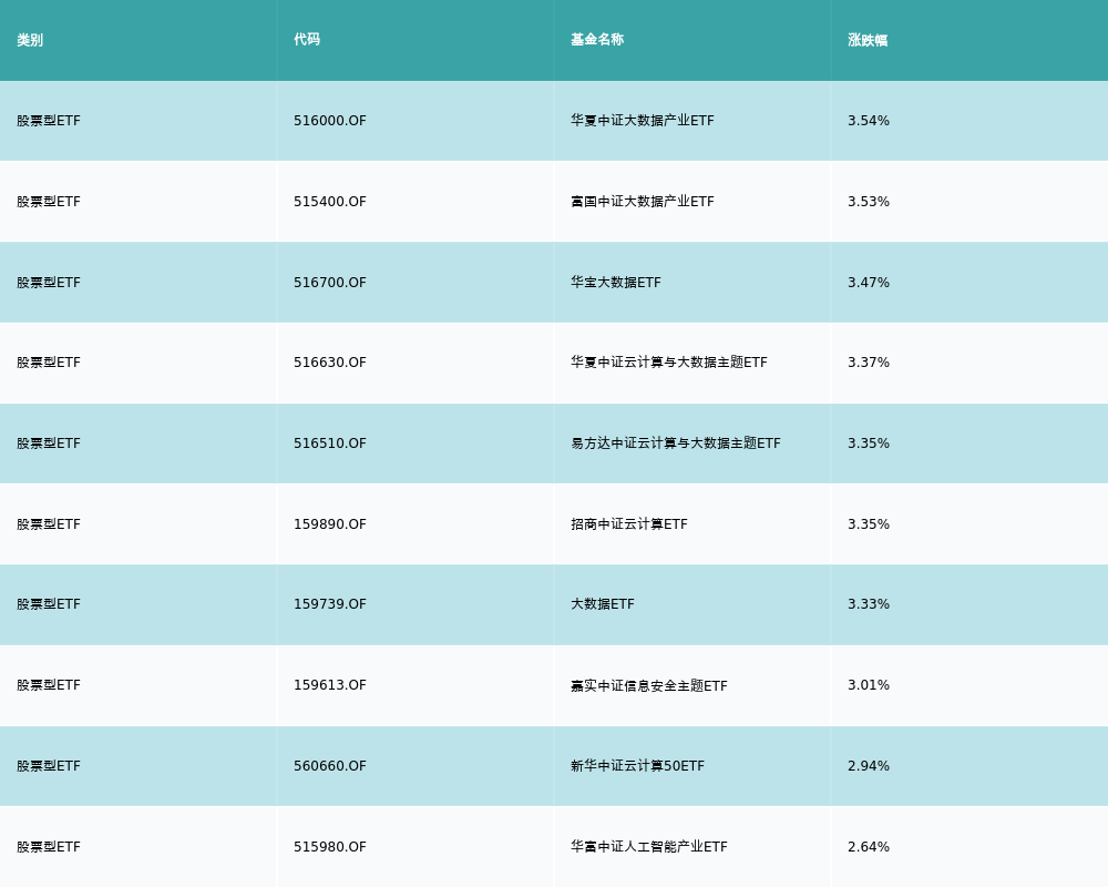 昨日股票型ETF涨幅最高的3支ETF及其收益率分别为:华夏中证大数据产业ETF(3.54%)、富国中证大数据产业ETF(3.53%)、华宝大数据ETF(3.47%)。涨幅前10详情见下表: