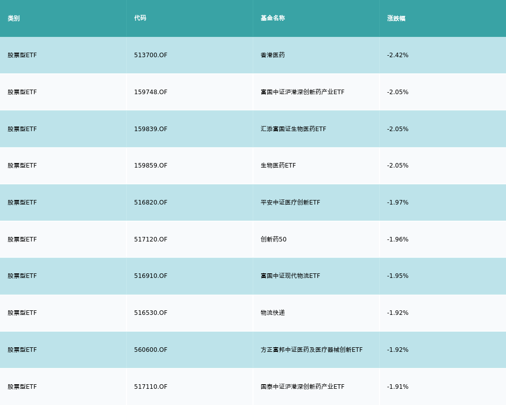 昨日股票型ETF跌幅最大的3支ETF及其收益率分别为:香港医药(-2.42%)、富国中证沪港深创新药产业ETF(-2.05%)、汇添富国证生物医药ETF(-2.05%)。跌幅前10详情见下表: