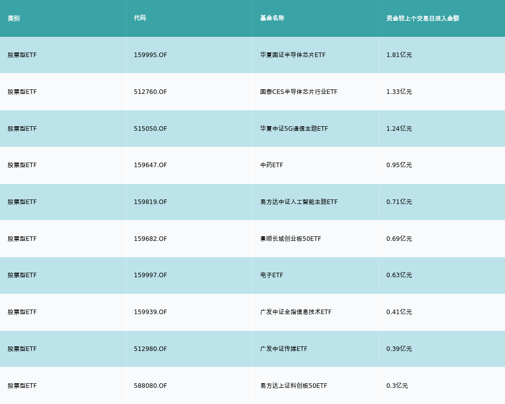昨日股票型ETF资金流入最多的3支ETF及其流入金额分别为:华夏国证半导体芯片ETF(流入1.81亿元)、国泰CES半导体芯片行业ETF(流入1.33亿元)、华夏中证5G通信主题ETF(流入1.24亿元)。资金流入前10详情见下表: