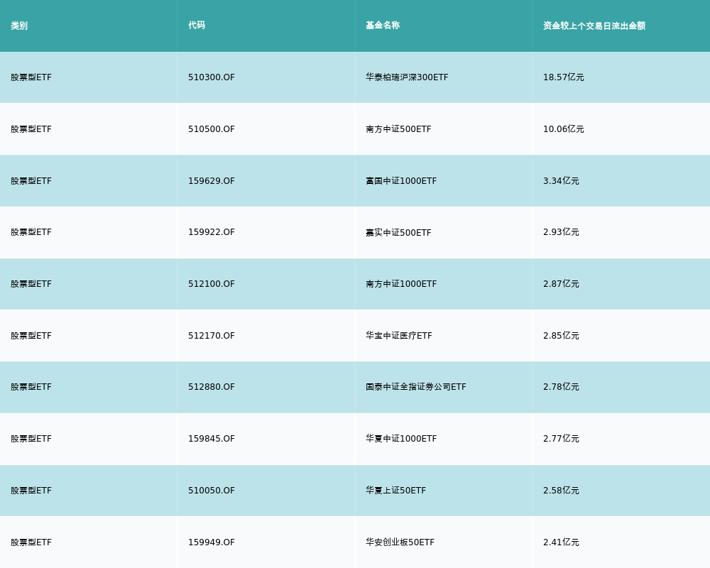 昨日股票型ETF资金流出最多的3支ETF及其流入金额分别为:华泰柏瑞沪深300ETF(流出18.57亿元)、南方中证500ETF(流出10.06亿元)、富国中证1000ETF(流出3.34亿元)。资金流出前10详情见下表: