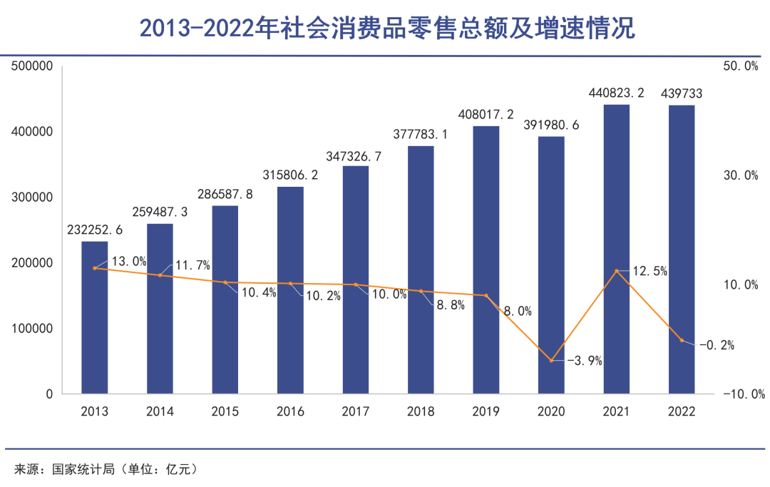 储蓄增加,第一受影响的肯定是消费。2023年1月17日,国家统计局发布2022年国民经济运行数据。2022年社会消费品零售总额439733亿元,比上年下降0.2%。