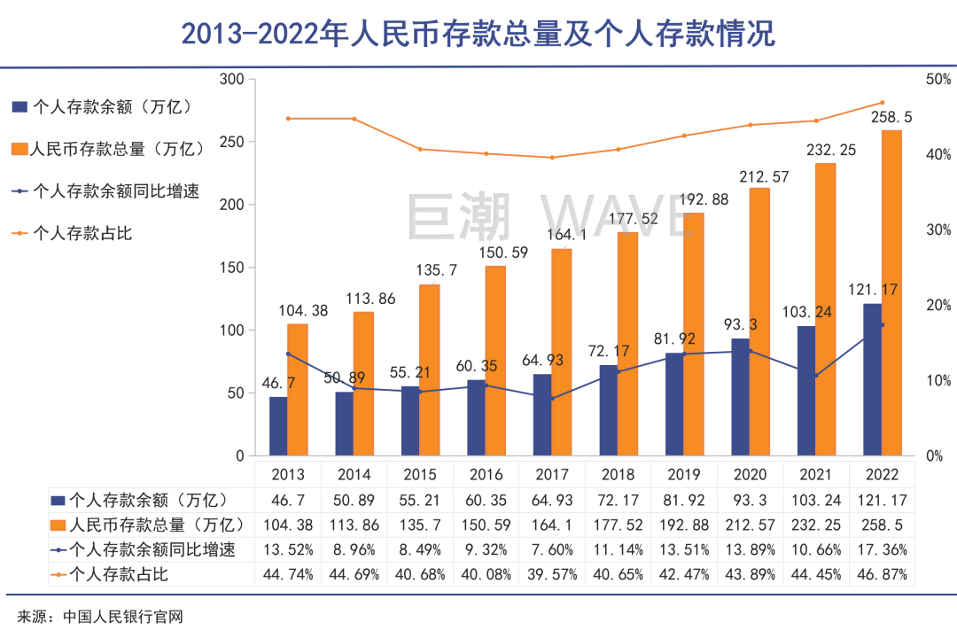 2018年是一个转折年。从那时起,我国个人存款余额增速又开始重新回到两位数水平,并持续上升。2022年,我国住户存款增加超过17.84万亿元,个人存款余额增速超过17%,个人存款占人民币存款总量比重也近47%,均成为近十几年来的最高水平。