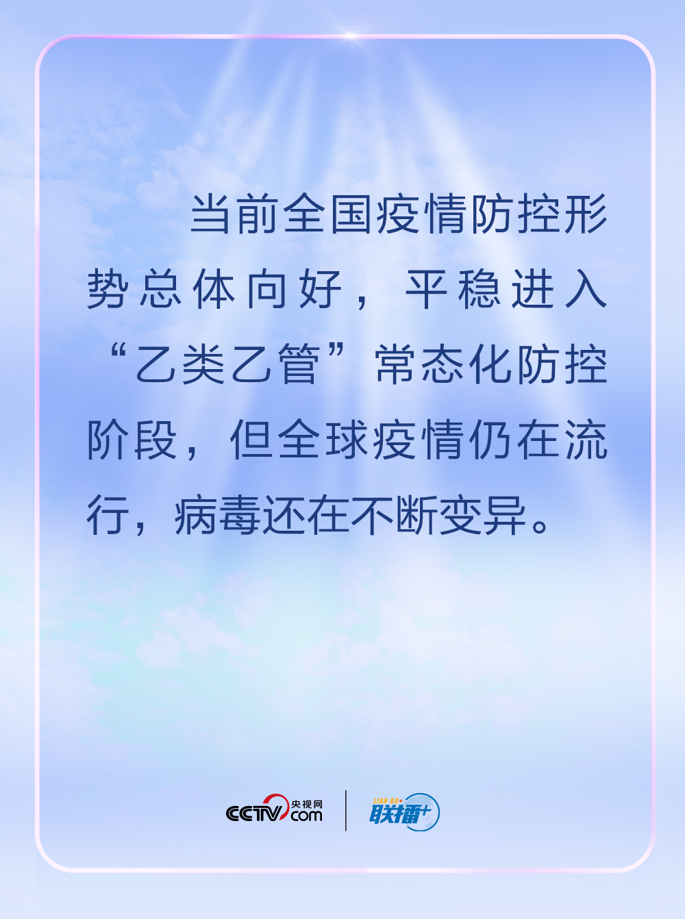 当前全国疫情防控形势总体向好,平稳进入“乙类乙管”常态化防控阶段,但全球疫情仍在流行,病毒还在不断变异。该如何做好下一步疫情防控工作?央视网《联播+》栏目梳理此次会议内容,与您一起学习。