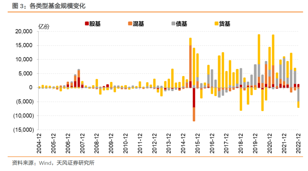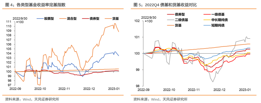 四季度货币基金规模有所收缩,主要是2022年11月以来宏观环境变化带来市场风险偏好提升、股债跷动,资金切换的结果。但由于债基规模收缩更为明显,货基占比略有上升。