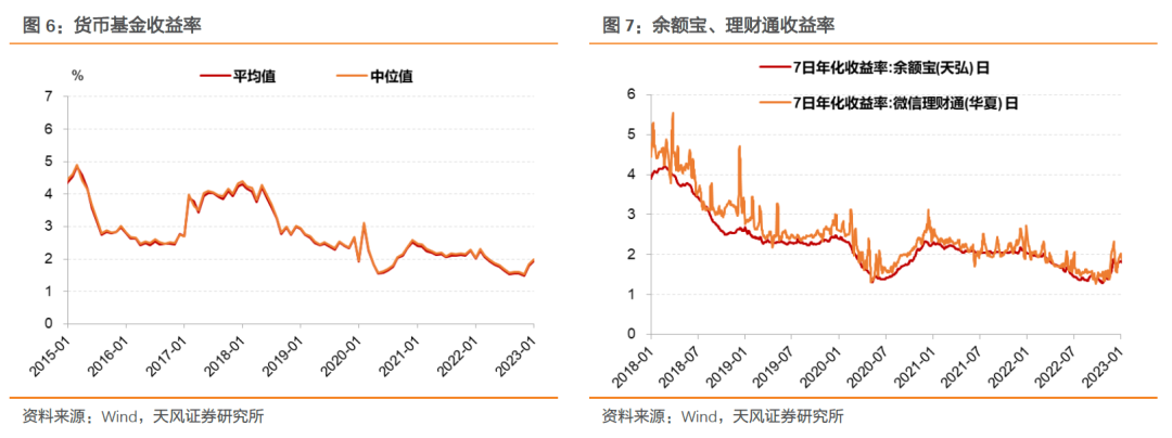 货基收益率低位企稳,12月后有所回升。四季度末,全市场收益率算术均值约1.77%、中位值约1.83%;余额宝和微信理财通的7日年化收益分别约为1.80%和2.17%。截至2023年1月底,全市场收益率算术均值约1.93%、中位值约1.99%;余额宝和微信理财通的7日年化收益分别约为1.84%和2.00%。