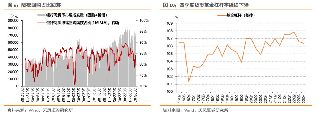 四季度,货币基金杠杆率回落至106.4%。银行间回购+拆借日成交量(约5.9万亿)较前期7万亿元以上缩量,隔夜占比降至85%左右。