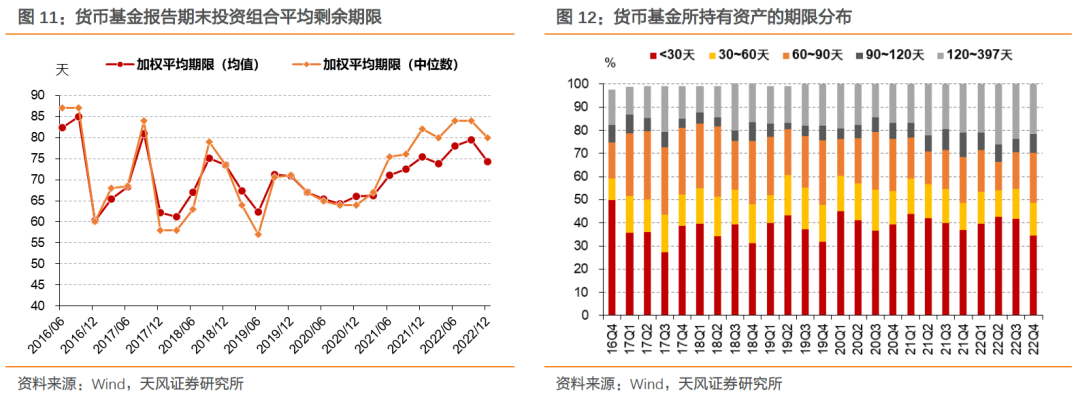 2022年四季度末,货币基金总份额10.45万亿份,季环比-1906亿份,自2020Q4以来首次出现规模收缩,占全部基金总规模比例较前一季度回升0.21个百分点至43.45%。