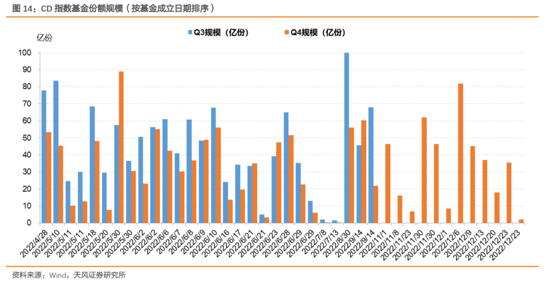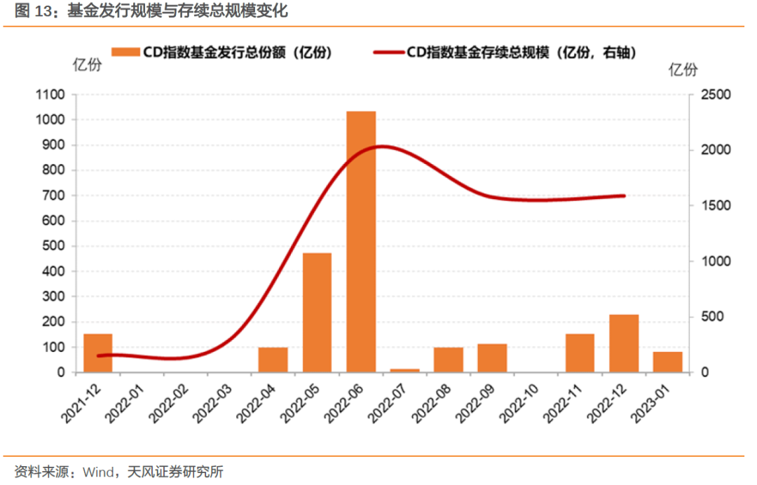 四季度新成立CD指数基金12只,此类基金存续规模由三季度末的1577亿份小幅上升至1590亿份。2023年1月另有2只发行,份额共计81.59亿份。