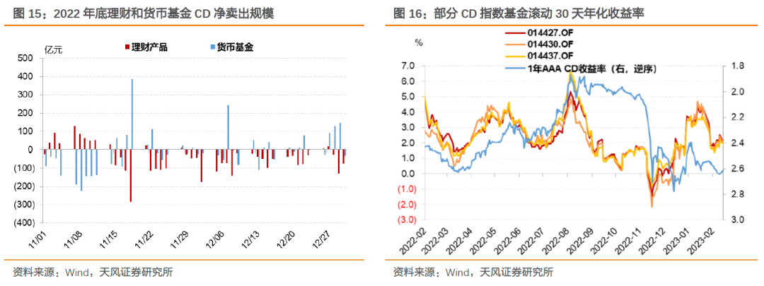 2022年11月后的债市调整中,机构行为助推基金收益率进一步下滑。广义基金是配置同业存单的重要力量,面对赎回压力,抛售流动性较好的同业存单成为优先选择之一,其抛售行为助推CD收益率上行,使得CD指数基金的收益率进一步下滑。