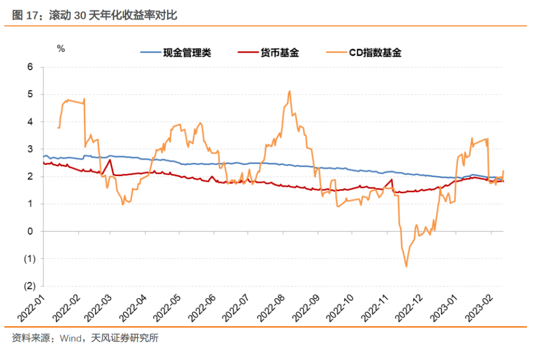 其本质原因在于收益表现不佳、且波动较大。2022年9月后资金面收敛带动同业存单收益率上行,市值法计价下,对CD指数基金净值产生显著不利影响。从10月初开始,滚动30天年化收益率就已经显著下行至较低水平。且广义基金面对赎回压力选择抛售CD,助推CD指数基金收益率进一步下滑。