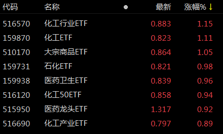ETF方面,化工行业ETF(516570)、化工ETF(159870)涨超1%,化工50ETF(516120)、化工产业ETF(516690)跟涨。