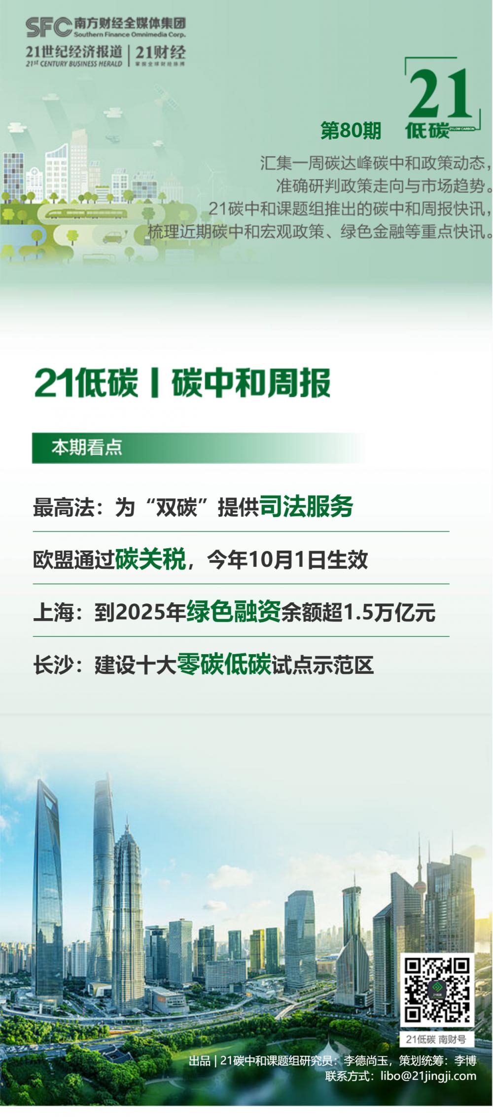 本期看点:最高法发文,为“双碳”提供司法服务;欧盟通过碳关税,今年10月1日生效;上海:到2025年绿色融资余额超1.5万亿元;长沙碳达峰方案:建设十大零碳低碳试点示范区。