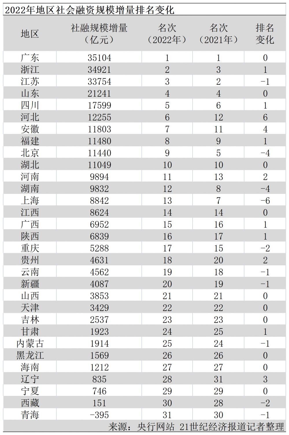 近日,央行网站公布2022年地区社会融资规模增量统计表,提供了区域金融分析和比较的视角。具体数据来看,广东、浙江、江苏继续领跑,其中广东继续拔得头筹,为35104亿元;浙江反超江苏位居第二,为34921亿元;江苏为33754亿元,位列第三。值得注意的是,前三名中,仅浙江一省社融实现同比多增,广东、江苏均为同比少增,且三省的企业债券融资均出现了明显下降。
