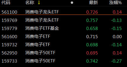 ETF方面,截至发稿,众多消费电子相关ETF下跌,只有消费电子龙头ETF(561100)、消费电子50ETF(562950)飘红,两只ETF第一大重仓股均为立讯精密。