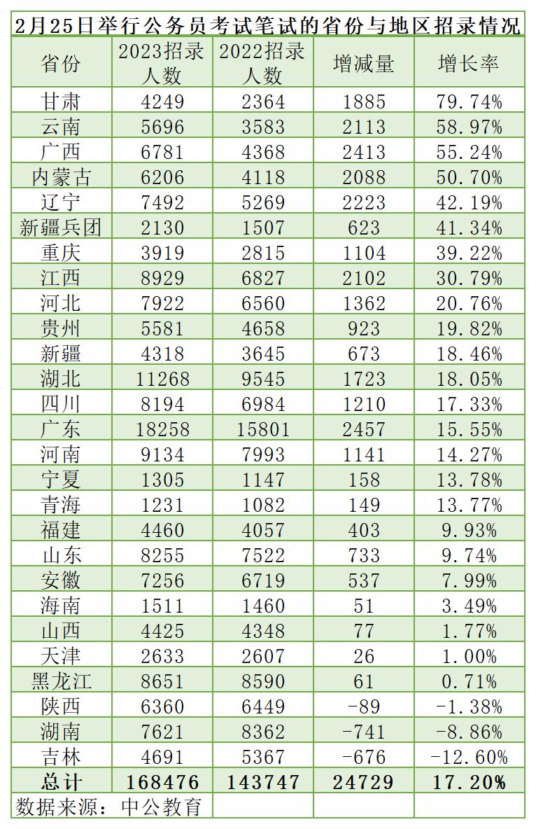 据中公教育统计数据显示,2月25日举行公务员考试笔试的27个省份共计招录168476人,比去年增加24729人,涨幅为17.2%,有24个省(市、区、新疆生产建设兵团)招录人数高于去年,仅有3个省份比去年略降。其中,甘肃、云南、广西、内蒙古4个省份的扩招规模超过50%。