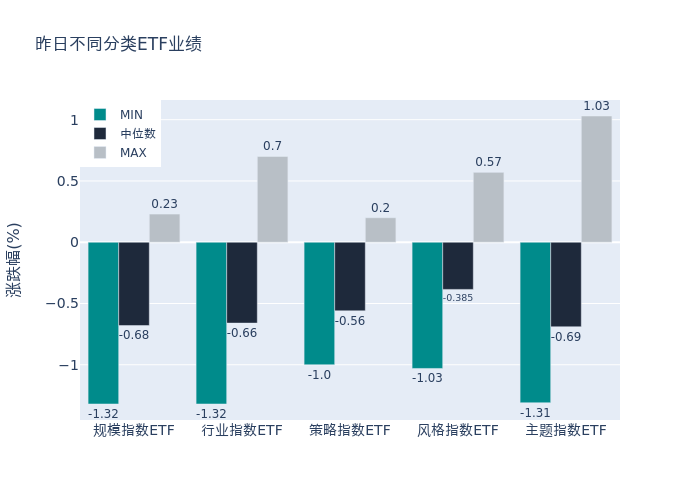 昨日股票型ETF收益率中位数为-0.67%。其中按照不同分类,规模指数中1000增强ETF收益率最高,为0.23%;行业指数中国泰中证全指软件ETF收益率最高,为0.7%;策略指数中华夏中证红利质量ETF收益率最高,为0.2%;风格指数中华夏中证智选1000成长创新策略ETF收益率最高,为0.57%;主题指数中嘉实中证信息安全主题ETF收益率最高,为1.03%。