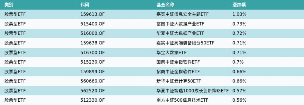昨日股票型ETF涨幅最高的3支ETF及其收益率分别为:嘉实中证信息安全主题ETF(1.03%)、富国中证大数据产业ETF(0.73%)、华夏中证大数据产业ETF(0.72%)。涨幅前10详情见下表: