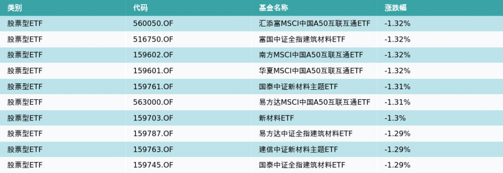 昨日股票型ETF跌幅最大的3支ETF及其收益率分别为:汇添富MSCI中国A50互联互通ETF(-1.32%)、富国中证全指建筑材料ETF(-1.32%)、南方MSCI中国A50互联互通ETF(-1.32%)。跌幅前10详情见下表: