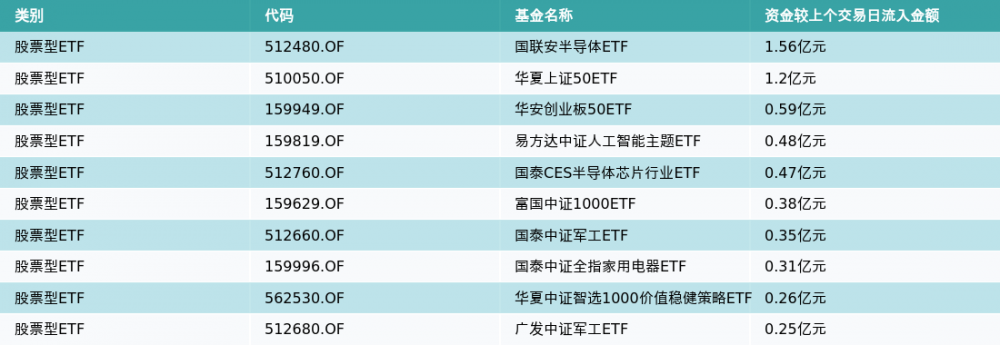 昨日股票型ETF资金流入最多的3支ETF及其流入金额分别为:国联安半导体ETF(流入1.56亿元)、华夏上证50ETF(流入1.2亿元)、华安创业板50ETF(流入0.59亿元)。资金流入前10详情见下表: