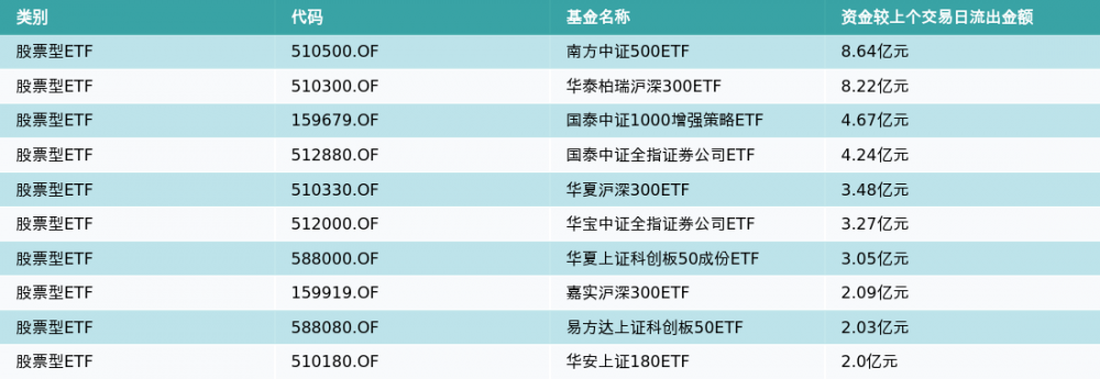 昨日股票型ETF资金流出最多的3支ETF及其流入金额分别为:南方中证500ETF(流出8.64亿元)、华泰柏瑞沪深300ETF(流出8.22亿元)、国泰中证1000增强策略ETF(流出4.67亿元)。资金流出前10详情见下表: