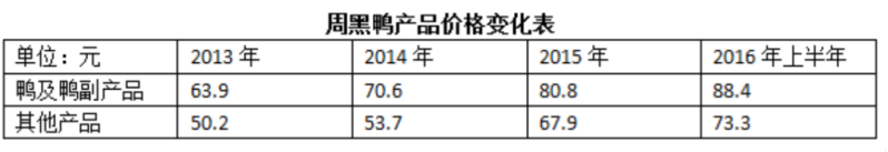 虽然大家都知道,就算穿一身爱马仕啃鸭脖,形象也一定是草根的,但周黑鸭却像“鬼迷了心窍”,生命不息,涨价不止。据周黑鸭招股书,2016年上半年时,周黑鸭的鸭货平均售价从63.9元/公斤涨到了88.4元/公斤,平均一年上涨8块。