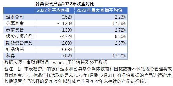 报告显示,理财公司发行的理财产品 2022 年平均回报为 0.52%,公募基金的 2022 年平均回报为-11.28%。