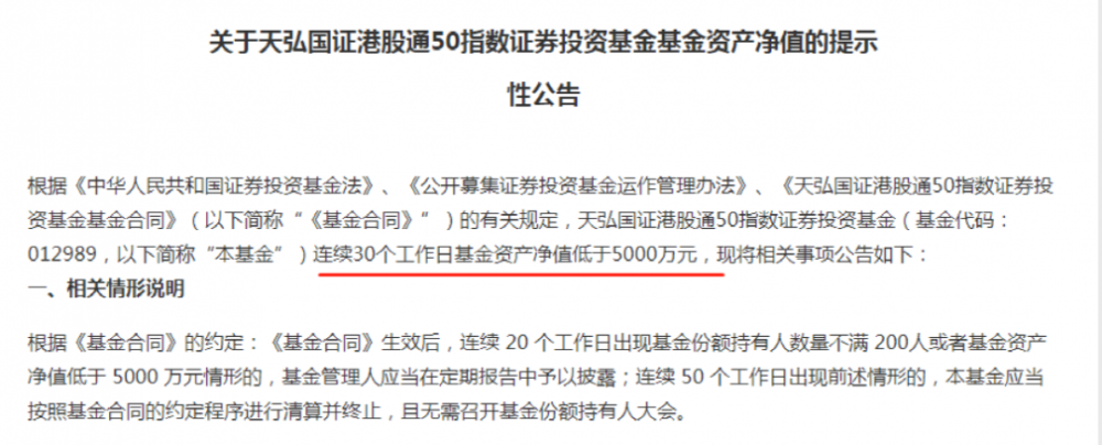 2月25日,天弘国证港股通50指数发布基金资产净值提示性公告,称截至02月23日日终,该基金已连续30个工作日基金资产净值低于5000万元。按照基金运作管理办法相关规定,如果基金资产净值连续50个工作日低于5000万元,将触发合同终止并进入清算程序。
