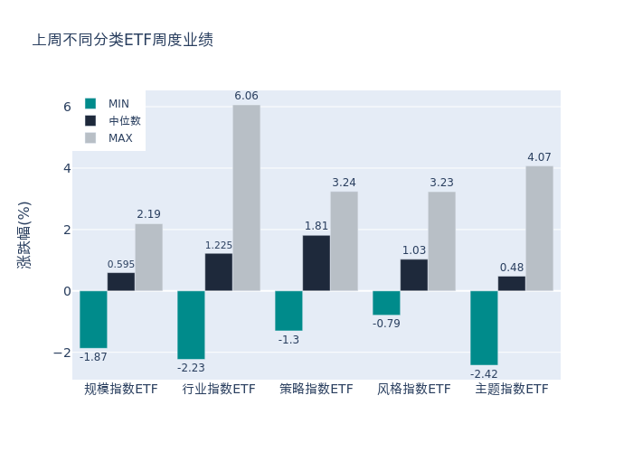 上周股票型ETF周度收益率中位数为0.645%。其中按照不同分类,规模指数中500指增周度收益率最高,为2.19%;行业指数中国泰中证煤炭ETF周度收益率最高,为6.06%;策略指数中华泰柏瑞上证红利ETF周度收益率最高,为3.24%;风格指数中富国中证价值ETF周度收益率最高,为3.23%;主题指数中广发中证光伏龙头30ETF周度收益率最高,为4.07%。